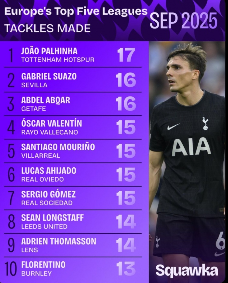 10月1日讯 今天,数据机构Squawka在社媒公布了九月份铲球榜,直播足球热刺中场球员帕利尼亚以17次成功铲球位居榜首。