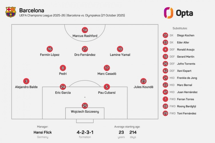 27岁的拉什福德是巴萨此役杆位中最年长的外场球员。