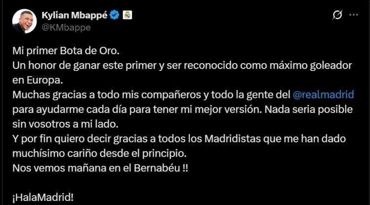 10月31日讯 不久前,获得欧洲金靴的皇马前场球员姆巴佩更新社交媒体,感谢了队友和球迷的支持。