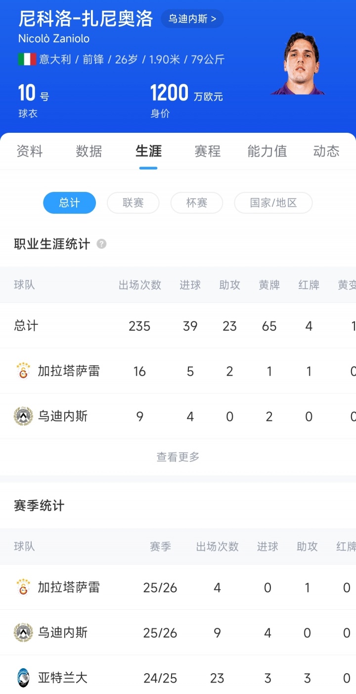 今年夏窗扎尼奥洛从加拉塔萨雷租借加盟乌迪内斯,赛季至今代表球队出战9场赛事 ,打进4球,已经刷新了个人近3个赛季最多的单赛季得分 数。