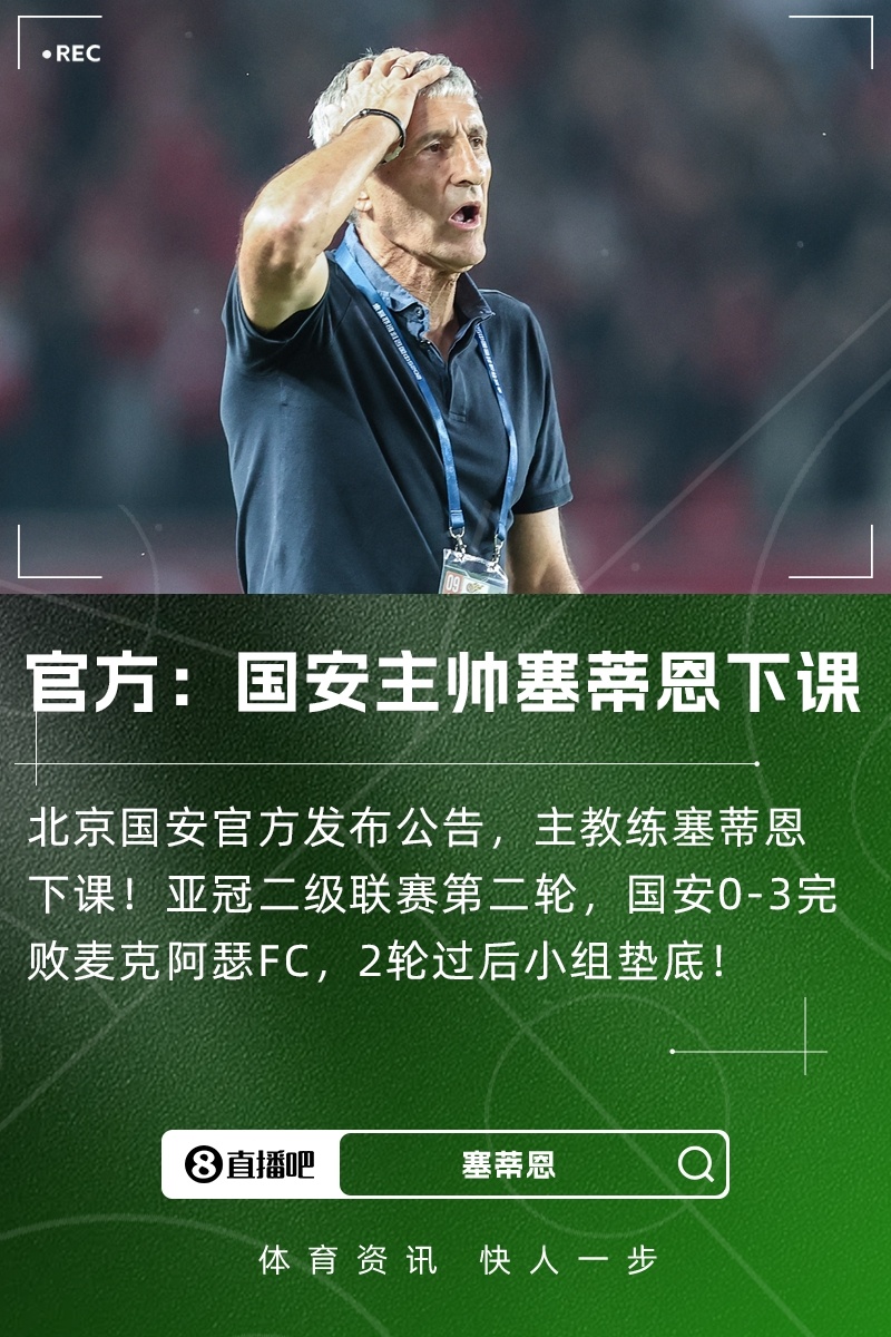 10月05日讯 北京国安官方消息,塞蒂恩不再担任球队主帅。