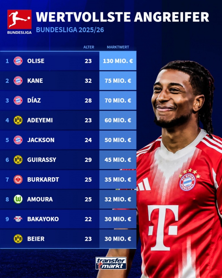 以下为德甲攻击 球员身价top10: