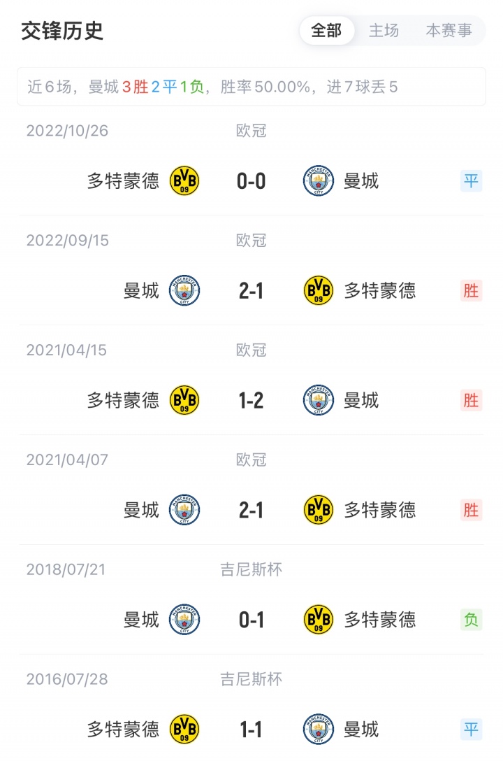 曼城欧冠2胜1平积7分,职业联赛 6胜1平3负积19分位居英超第二,各项赛事两连胜;多特欧冠同样2胜1平积7分,职业联赛 6胜2平1负积20分暂位德甲第三,各项赛事连续4场不败。曼城对阵多特已连续4场不败(3胜1平)。