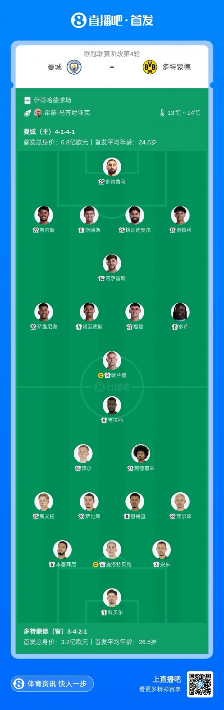 11月6日讯 欧冠职业联赛 阶段第4轮,曼城主场作战 迎战多特蒙德,赛前双方杆位公布。【曼城方面,哈兰德战旧主,赖因德斯、萨维尼奥、福登悉数先发,B席、胡桑诺夫、谢尔基后备 待命;多特方面,24直播足球高清完整版吉拉西、阿德耶米领衔先发,小贝林、法比奥·席尔瓦坐镇后备 席。】