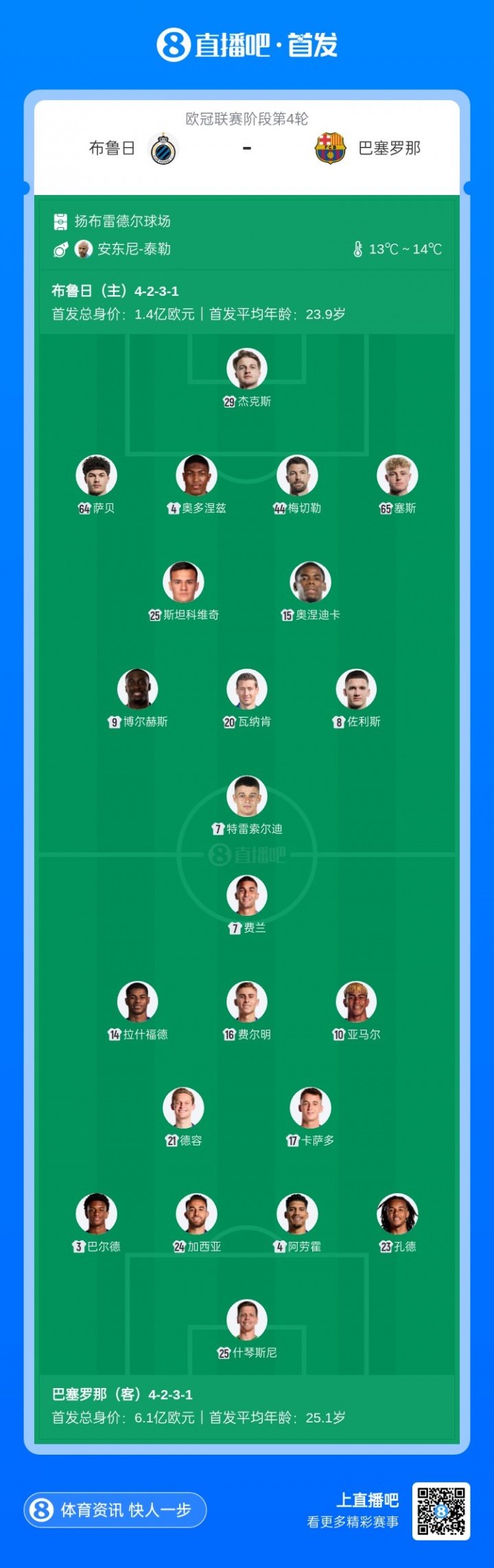 11月6日讯 北京时间11月6日4:00,欧冠第4轮,布鲁日vs巴萨。赛前双方公布了杆位名单。【巴萨方面,延续了拉什福德-费兰-亚马尔三叉戟,中场球员位置卡萨多搭档德容组成后腰组合,此前伤愈的莱万、奥尔莫本场继续后备 待命。】