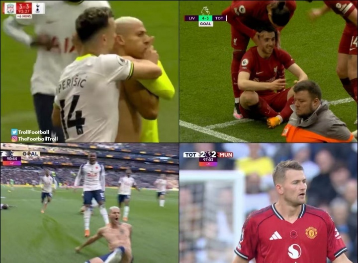 11月08日讯 英超第11轮,热刺vs曼联,赛事 第91分钟,里沙利松破门+脱衣庆祝,但随后德里赫特破门扳平比分,值得一提的是,免费足球直播app下载这一幕曾在2023年热刺不敌利物浦的赛事 上演过。