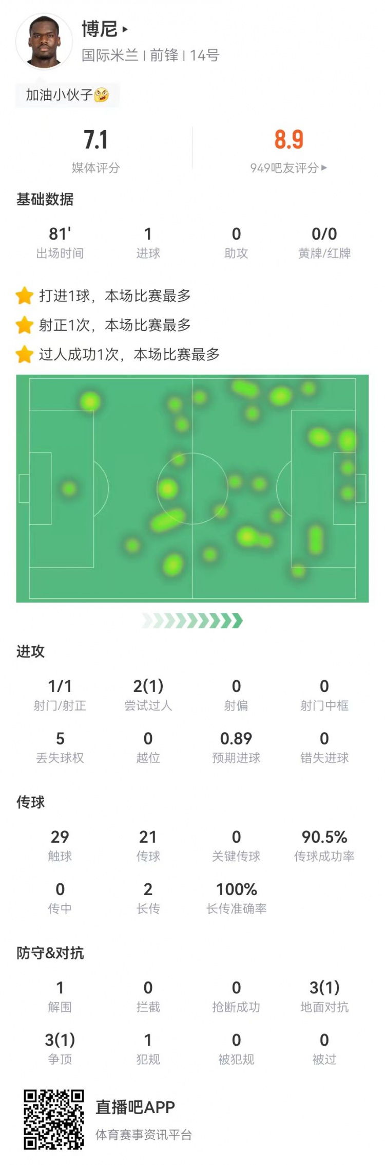 11月10日讯 本轮意甲焦点战国米2-0力克拉齐奥,博尼本场数据如下:
