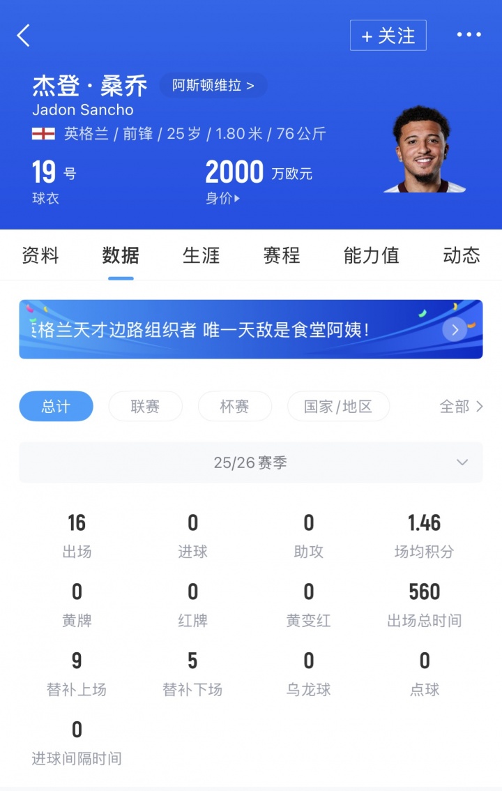 桑乔租借至维拉后目前各项赛事16场仍然0球0助,球员周薪20万镑维拉承担80%