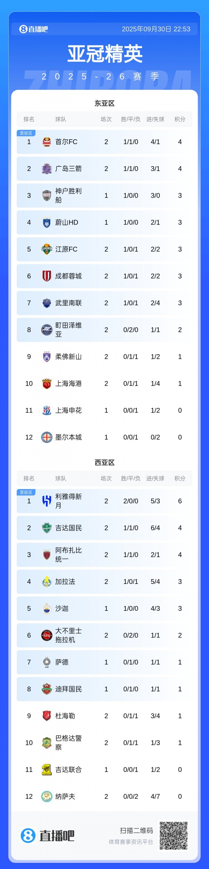 最新的积分榜,蓉城3分升至东亚区第5,海港1分第10,直播足球申花少赛1场积0分,排名第11。海港和申花暂时处于东亚区出回合区。