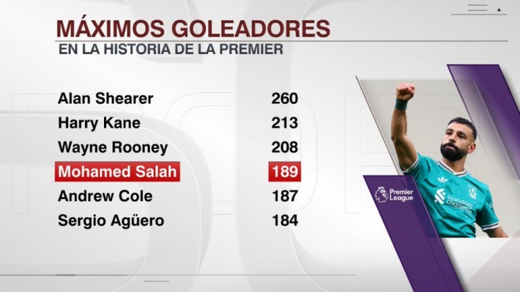 据ESPN统计,直播足球萨拉赫目前在英超打进189球,排名历史射手榜第四位,差19球追平排名第三的鲁尼。