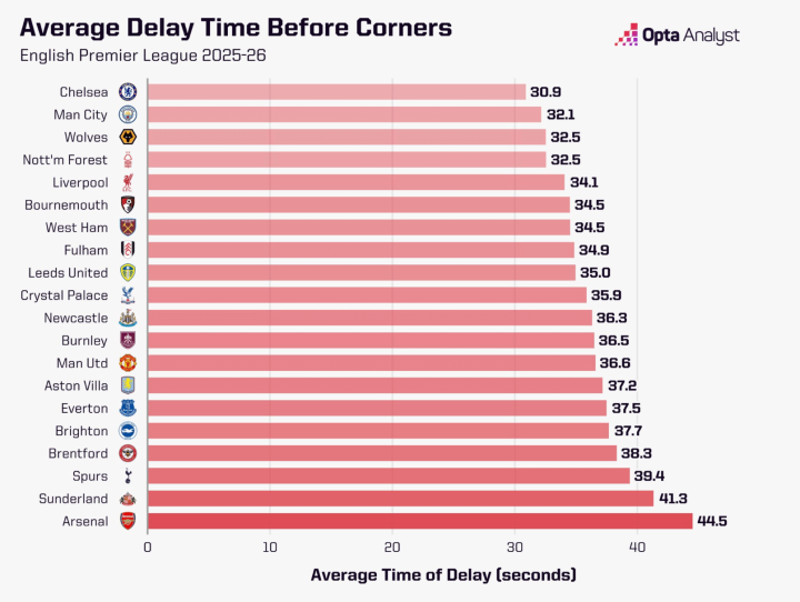 英超角球时机射门拖延时间榜: 枪手平均44.5秒最慢, 曼城30.9秒最快