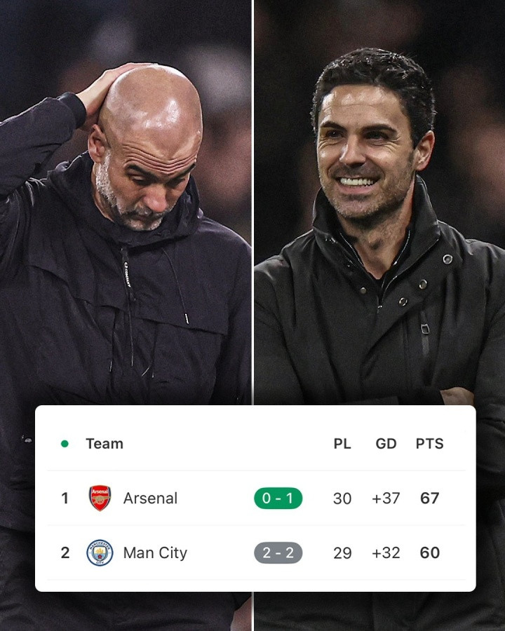 播出吧03月05日讯英超第29轮结束,阿森纳1-0击败布莱顿,曼城2-2战平诺丁汉森林。本轮之后,阿森纳多赛一场领先曼城7分,占有争冠的主动权。