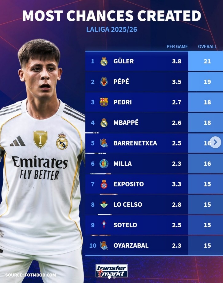 9月30日讯 德转盘点了本赛季西甲创造机会榜单,其中居勒尔共计21次创造机会居首,具体如下(场均数据+总数据):