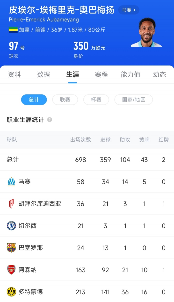 今年夏窗自由身回归马赛后,直播足球奥巴梅扬本赛季7场赛事 已经贡献了4粒得分 和2次助功 。目前36岁的奥巴梅扬德回转 价为350万欧元,而在2018年巅峰期 时期,效力于阿森纳的奥巴梅扬身价最高曾达到7500万欧元。