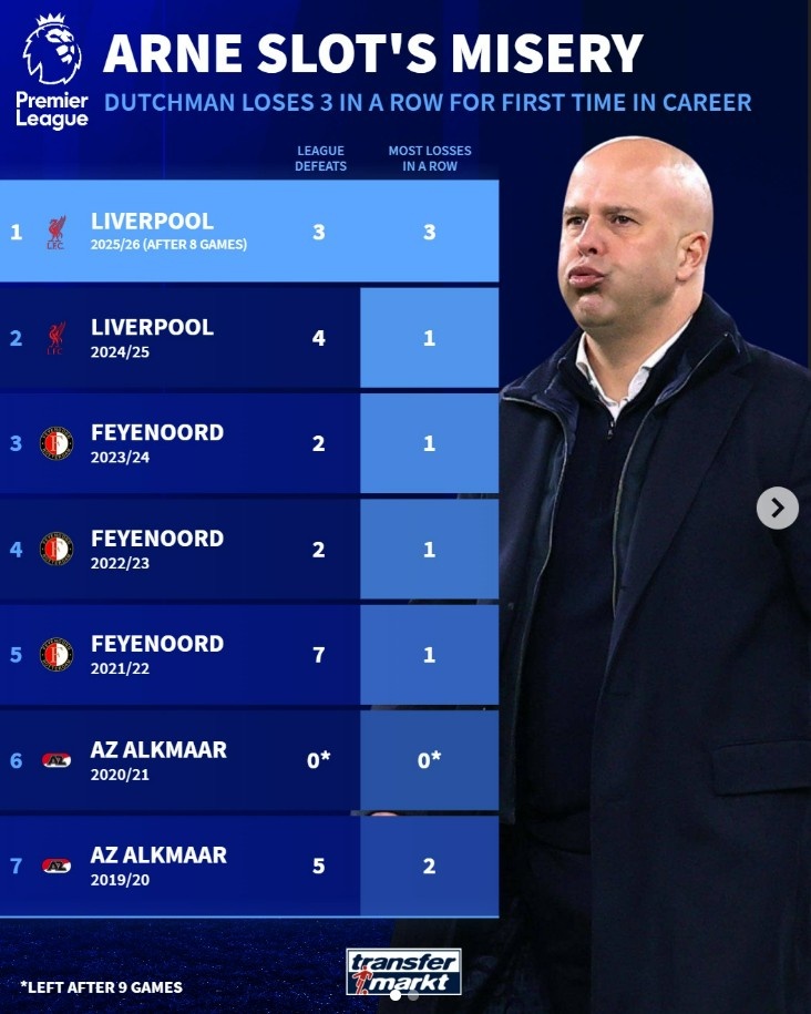 10月20日讯 在本轮英超,利物浦1-2不敌曼联。这也是斯洛特执教生涯首次遭遇职业联赛 三连败,以下为他执教具体情况: