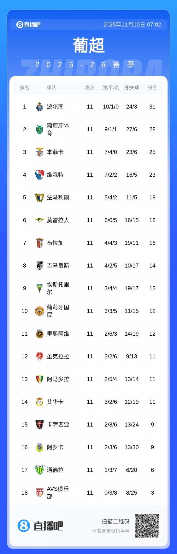 11轮职业联赛 过后,本菲卡暂积25分排名积分榜第3,追赶 榜首的波尔图6分。