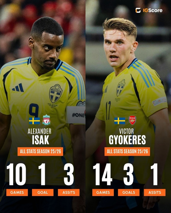 本赛季约克雷斯代表阿森纳和瑞典国家队出战14场赛事 ,贡献3粒得分 和1次助功 ,目前他的德回转 价为7500万欧元;伊萨克则代表利物浦和瑞典出战10场赛事 ,贡献1粒得分 和3次助功 ,德回转 价1.2亿欧元。