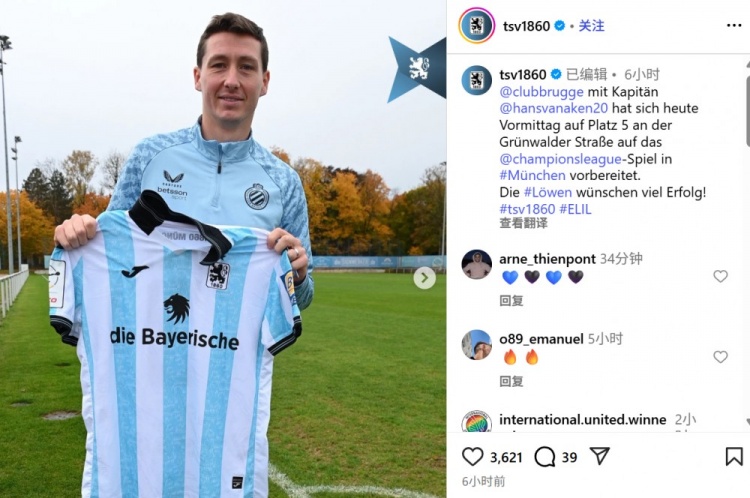 与此相呼应的是,布鲁日队今天上午选择的赛前动员练习 场地,恰恰是拜仁同城死敌慕尼黑1860的练习 基地——这位德甲第三级别职业联赛 的球队甚至向他们的比利时客人赠送了一件运动活动 服 ,并在Instagram上祝愿他们在对阵拜仁的赛事 中好运。