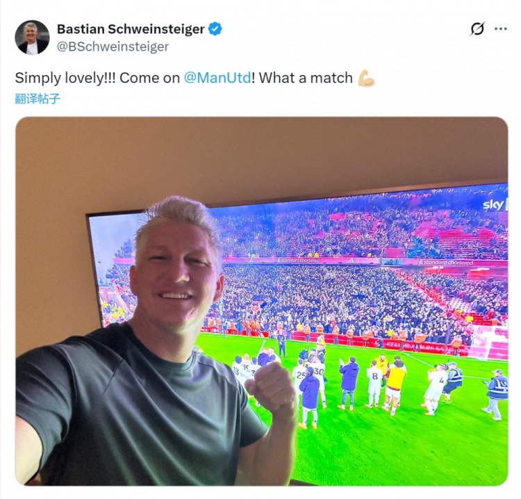曼联旧将、德国足坛名宿施魏因斯泰格通过电视观看双红会,赛后他晒出自己在电视机前的照片,足球直播配文:“简直太美妙了!助威 曼联,多么出色 的赛事 !”